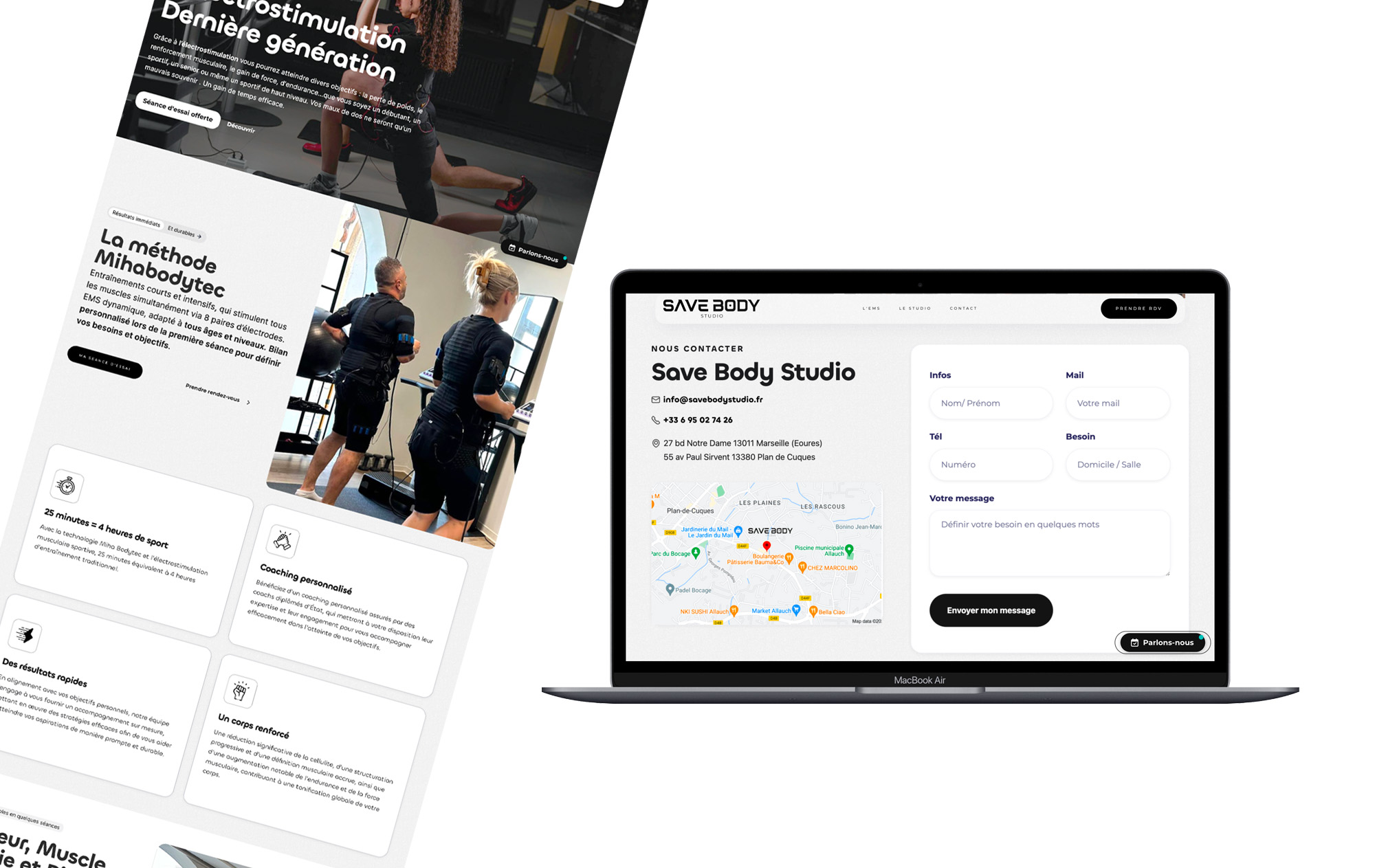 Création du Logo et Charte Graphique Personnalisée : Nous avons conçu un logo et une charte graphique entièrement personnalisés pour Save Body Studio, qui reflètent la modernité et l'aspect high-tech de l'électrostimulation. Cette identité visuelle unique positionne clairement le studio comme une référence dans le secteur du fitness innovant.